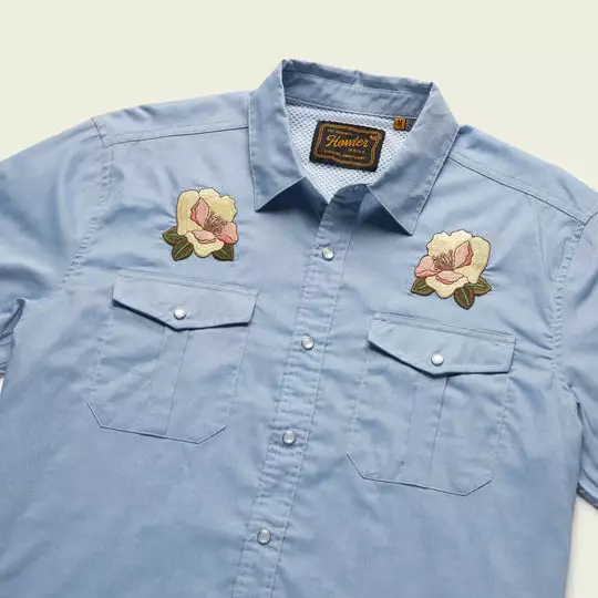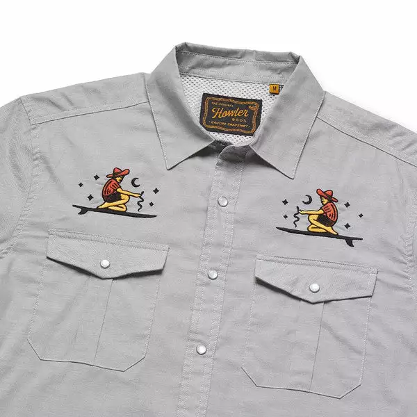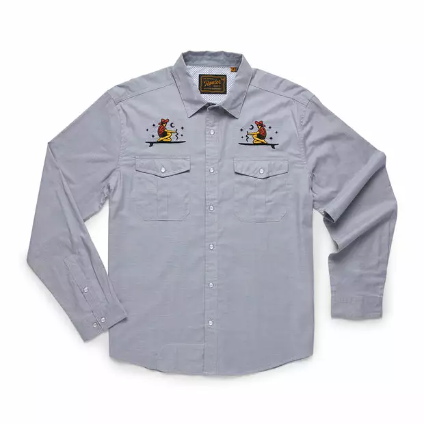 Our desire to make the Gaucho Snapshirt is one of the reasons we started Howler Brothers in the first place. We wanted to transform the vintage western shirts of the past into something technical and wearable in everyday life while maintaining a little of their quirky nature and penchant for unique, embroidered artwork. We succeeded in a big way by making ours out of lightweight, quick drying cotton-poly blend and adding a cooling mesh-lined vented back yoke to keep it cool when the temperatures are cooking. We threw in pleated chest pockets, pearl snaps, and an ever-evolving slate of custom embroidery.